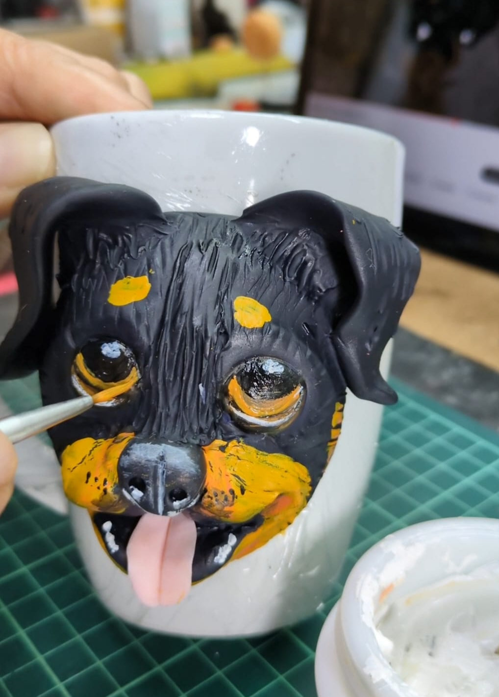 Também crio peças personalizadas dos vossos companheiros de quatro patas — canecas e ímãnes modelados e pintados à mão, através de uma foto. São pequenas homenagens cheias de ternura, feitas para eternizar os sorrisos e as memórias que eles nos deixam.
